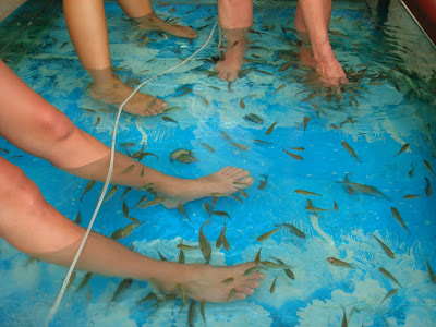 Muitas casas de massagens, tendo no passeio um tanque com peixinhos devoradores de pele morta. As pessoas sentavam-se na borda do tanque, metiam lá os pés e os peixes faziam o seu trabalho de limpeza...